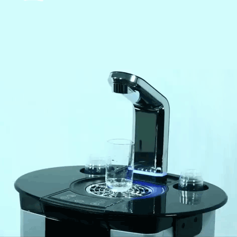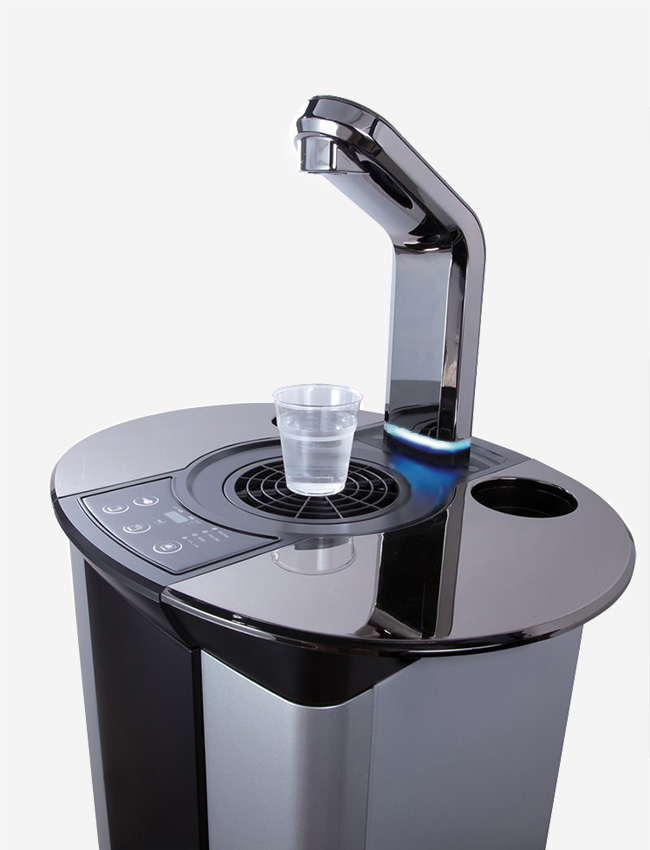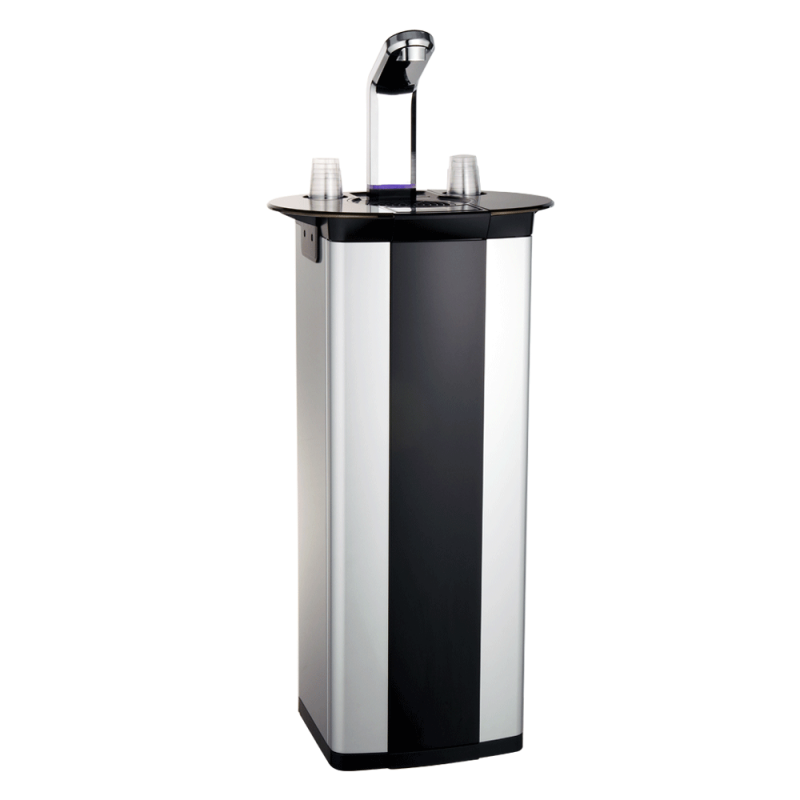 Dank des Bedienfeldes können alle Wasserarten hygienisch ohne Kontakt zum Wasserhahn entnommen werden. Der vollständig verkleidete Entnahmehahn hat eine optimale Höhe, sodass auch Karaffen befüllt werden können. Der Entnahmebereich wird durch blaue LEDs beleuchtet, welche ein stilvolles Ambiente erzeugen.