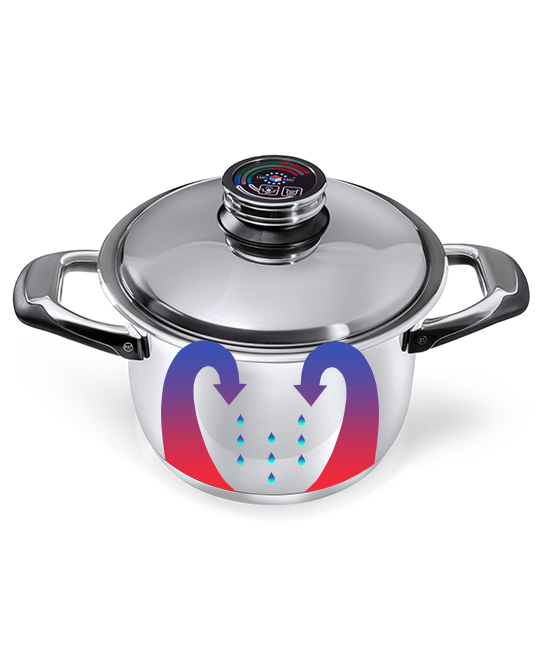 Aufgrund der besonderen Eigenschaften unserer Kochtöpfe steigen in den Lebensmitteln enthaltene Flüssigkeiten während des Kochvorgangs als Dampf nach oben und sammeln sich an der Deckelunterseite. Dort kühlt der Dampf aufgrund des Dicken- und Temperaturunterschieds von Boden und Wänden wieder ab und benetzt das Kochgut in Form von winzigen Kondenstropfen. Dank des Thermoanzeigers musst du den Deckel während des Kochvorgangs nicht anheben. Auf diese Weise geht kein Dampf verloren, was die jegliche Zugabe von Wasser oder anderen Gewürzen überflüssig macht. So kannst du beispielsweise Gemüse und Kartoffeln schonend garen, sodass Vitamine und Mineralstoffe erhalten bleiben.